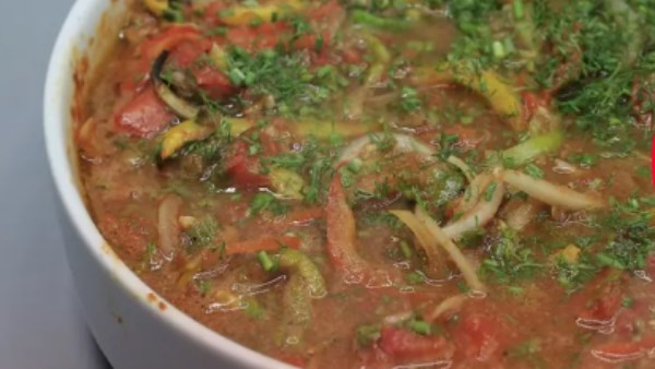 المقادير: سبيط شرائح، زيت، فلفل ألوان مقطع، بصل، ثوم مفروم، فلفل أخضر، بقدونس مقطع، كرفس مقطع، طماطم مكعبات، عصير طماطم، صلصة طماطم، ملح، كزبرة، كمون.