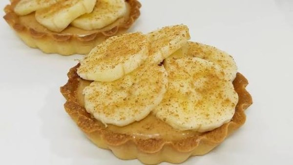 ابدأ بتحضير العجينة بمقادير: 150 جرام دقيق، 100 جرام زبدة، 50 جرام سكر بودرة، كيس فانيليا واحد. للحشو: موز، نصف كوب سكر، ملعقة صغيرة قرفة، عصير ليمون، نصف كوب ماء، ملعقة صغيرة نشا، وزبدة. للتزيين: ورق نعناع.