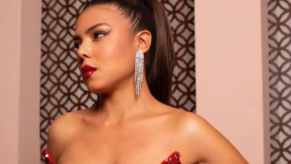 من الناحية الجمالية، ظهرت بخصلات شعر بني متموجة منسدلة على كتفيها، مع مكياج جذاب مرتكز على ألوان تتناغم مع لون بشرتها.