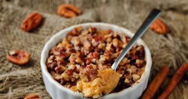 المقادير: 4 حبات بطاطا حلوة متوسطة الحجم، كوب حليب دافئ، 3 ملاعق كبيرة قشطة أو كريمة، نصف كوب سكر (أو حسب الرغبة)، ملعقة صغيرة فانيليا، رشة قرفة، 3 ملاعق زبدة، نصف كوب مكسرات مجروشة (جوز وبندق ولوز)، ملعقة عسل نحل (اختياري للتقديم).