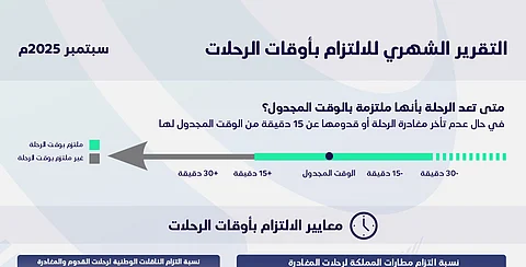 أصدرت الهيئة العامة للطيران المدني اليوم تقريرها الشهري عن التزام المطارات والشركات الوطنية بأوقات الرحلات لشهر سبتمبر 2025 وفق حالة مغادرة الرحلة أو قدومها خلال فترة تقل عن 15 دقيقة من الوقت المجدول، وذلك بهدف تزويد المسافرين برؤية واضحة حول مدى الالتزام وتحسين تجربة السفر.