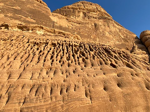 تفتح الصخور القاسية في جبل أثلب العلا فضول الزائرين عندما تقف أمام واجهاته الصخرية المليئة بثقوب دقيقة تبدو كأنها منحوتة بعناية. هذه التشكيلات الطبيعية المثيرة تعرف باسم التافوني، وهي إحدى الظواهر الجيولوجية التي تميّز صخور الحجر الرملي في العلا.