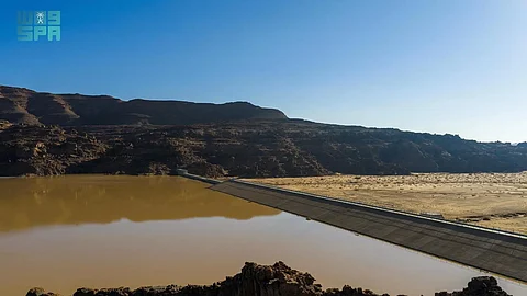 سد وادي ضم في تبوك يتحول إلى بحيرة بعد أمطار غزيرة