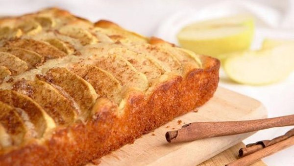 صبّي الخليط في القالب وزيّني بشرائح تفاح.