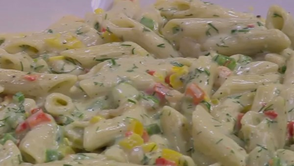 استخدم مكرونة قلم مسلوقة، جمبري مقشّر، كريمة طبخ، ثوم مفروم، زبدة وزيت زيتون، ملح وفلفل، فلفل ألوان مفروم ناعم، بشر ليمون وشبت مفروم.