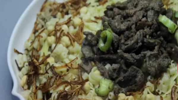للتقديم: يغرف خليط الأرز والعدس مع المكرونة المسلوقة، وتضاف على الوجه صلصة الطماطم والكبدة والبصل المحمر والحمص المسلوق حسب الرغبة، ويمكن أن يقدم خليط الكبدة مع الخبز الفينو.