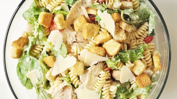 ٢ صدور دجاج منزوعة العظم والجلد، ٢٠٠ جرام معكرونة مسلوقة، ٢ كوب خس مقطع إلى شرائح، ¼ كوب جبن بارميزان، ⅓ كوب من الخبز المحمص أو فتات الخبز، ¾ كوب مايونيز، ٣ ملاعق كبيرة عصير ليمون، ٤ ملاعق كبيرة خردل ديجون، ½ ملعقة كبيرة من صلصة ورشيسترشاير، ¼ ملعقة صغيرة ملح، ¼ ملعقة صغيرة فلفل، ٢–٣ ملاعق كبيرة من الماء لتخفيف الصلصة.