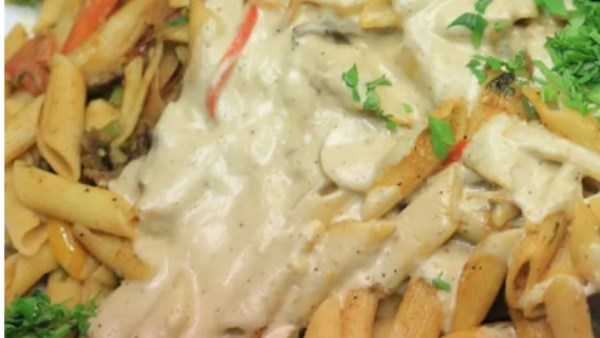تُضاف اللحمة والمكرونة وصوص الطحينة وتُترك جميع المكونات حتى تمتزج. أضف ماء سلق المكرونة إذا احتجت للمساعدة في المزج.