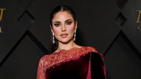 ارتدت فستانًا طويلًا من المخمل بلون النبيتي، وامتاز الكم بالدانتيل الراقي الذي زاد من أناقتها.