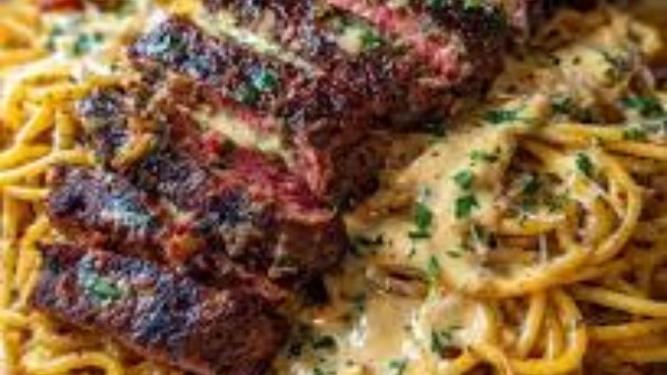 قدّم المكرونة، وضع شرائح اللحم المشوية على الوجه ورش بقدونس.