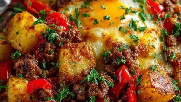 تكفي المقادير التالية 4–5 أشخاص وتضم بطاطس مكعبات مقدارها 1 كجم، لحمًا مفرومًا قدره 500 جم، بصلًا مفرومًا ناعمًا حبة كبيرة (حوالي 150 جم)، ثومًا مفرومًا أربع فصوص، فلفل ألوان مقطع مكعبات حبتان (أحمر وأصفر)، صلصة طماطم مقدارها 2 كوب (400 مل)، معجون طماطم مقدار 2 ملعقة كبيرة، مرق لحم أو ماء ساخن نصف كوب (120 مل)، زيت ثلاث ملاعق كبيرة، ملح 1½ ملاعق صغيرة، فلفل أسود 1 ملعقة صغيرة، بابريكا 1 ملعقة صغيرة، بهارات لحمة 1 ملعقة صغيرة، زعتر أو ريحان مجفف اختياري ½ ملعقة صغيرة، وموزاريلا مبشورة قدرها 250–300 جم.