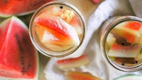 استَخدم الجزء الأبيض من القشرة بعد إزالة اللب الأحمر، وانقعه في ماء وملح مع الثلج للحفاظ على القرمشة. اسلقه قليلًا ثم احفظه في شراب من السكر والخل وشرائح الليمون والتوابل. اتركه ليلة كاملة قبل التعبئة. يتميز بقوام مقرمش وطعم مميز مع المشويات.