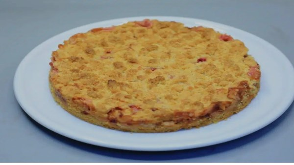 ضع الحشوة فوق خليط الفتات في القالب، ثم أضف باقي خليط الفتات فوق الحشوة.