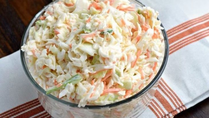 يُستخدم 2 كوب كرنب أبيض مبشور ناعم، وجزرة مبشورة، مع 2 ملاعق كبيرة مايونيز، وملعقة كبيرة سكر، وملعقة كبيرة خل، و2 ملاعق كبيرة لبن، ورشة ملح، ورشة فلفل أسود حسب الرغبة.