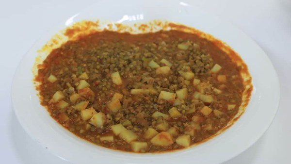 عدس بني منقوع، بصل، ثوم مفروم، فلفل حار، صلصة طماطم، عصير طماطم، زيت، كمون ناعم، ملح، فلفل أسود، بطاطس مكعبات صغيرة.