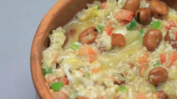 يُضاف الفول والبيض ويُقلب الخليط معًا حتى يندمج الطعم وتتمازج المكونات.