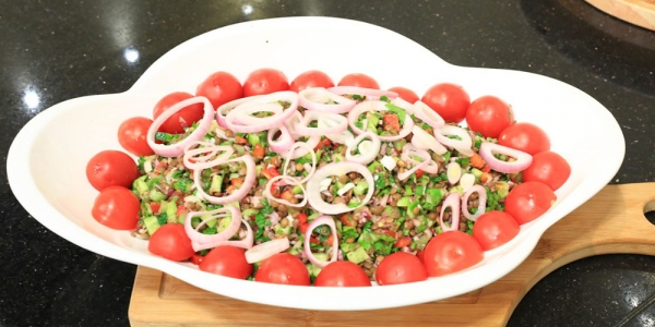 ابدأ بتحضير عدس بجبة المسلوق واخلط معه مكعبات خيار صغيرة، مكعبات طماطم صغيرة، جبنة براميلي ناشفة مقطعة، وبقدونس مفروم، بالإضافة إلى بصل أحمر مكعبات صغيرة، ثم أضف نصف كوب عصير ليمون، ورشة زيت زيتون، وكمون، وملح، وفلفل أسود حتى تتجانس النكهات.