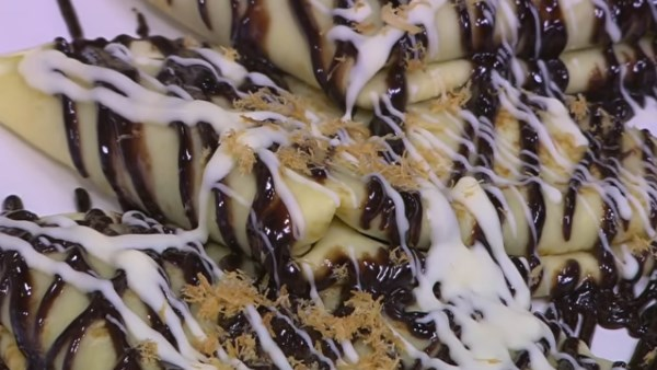 للتزيين: وزّع صوص شوكولاتة غامقة وصوص شوكولاتة أبيض لتزيين الكريب قبل التقديم.