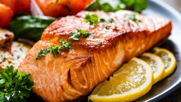 وتوصي جهة صحية بتناول 1–2 حصة من الأسماك الدهنية أسبوعيًا، مثل السلمون.