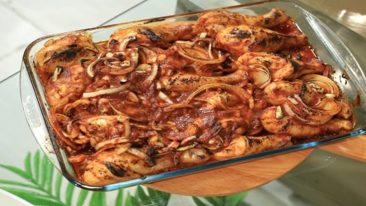ابدأ بتحضير مكوّنات الوصفة التالية: كيلو دبابيس دجاج بالجلد، 1 و½ كيلو بطاطس، ½ كيلو بصل حلقات، ½ كيلو بصل مفروم، ½ كيلو طماطم حلقات، ½ كيلو طماطم مبشورة، شرائح باذنجان، بهارات دجاج، ملح، فلفل أسود.