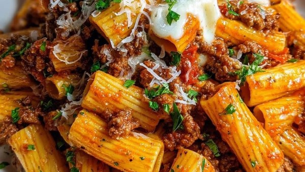 مكرونة ريجاتوني باللحمة المفرومة وصوص الطماطم
