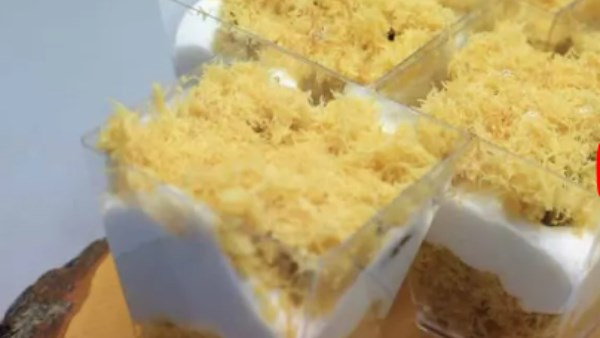 ابدأ بوضع طبقة من الكنافة المحمرة في قاعدة الكوباية.