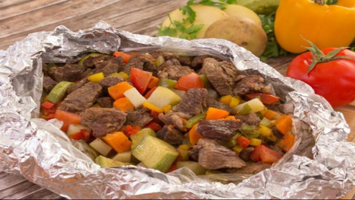تجهز ورقة فويل أو ورق زبدة وتوضع فيها شرائح البطاطس والبصل والطماطم.