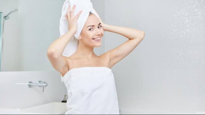 ابدئي بالاستحمام بالماء الساخن لمدة 10 إلى 15 دقيقة لتفتح مسام البشرة وتكون البشرة رطبة وجاهزة للتنظيف.