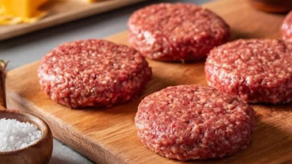 نفرد أكياس الثلاجة على سطح مكبس البرجر أو غطاء العلبة الدائري حتى نصنع أشكال أقراص البرجر، ثم ندخل البرجر إلى الثلاجة لمدة لا تقل عن ساعة.