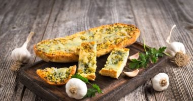 جهزي رغيف خبز فينو أو أي عيش مفضل ونصف كوب زبدة مذابة وثلاثة فصوص ثوم مفروم ناعم وملعقة صغيرة بقدونس مفروم وكوب جبنة موزاريلا مبشورة ورشة ملح وفلفل أسود.