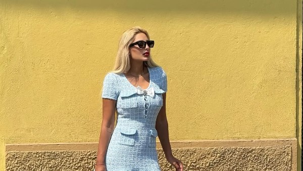 ظهرت في الصور بإطلالة أنيقة وملفتة، مرتدية فستانًا قصيرًا فوق الركبة باللون السماوي.