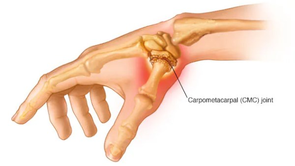 تتآكل غضاريف مفصل قاعدة الإبهام مع التقدم في العمر أو نتيجة إصابة سابقة، فيؤدي ذلك إلى احتكاك مباشر بين العظام وظهور التهاب وألم حاد عند استخدام الإبهام مع تورم وتيبس وضعف في حركة المفصل.