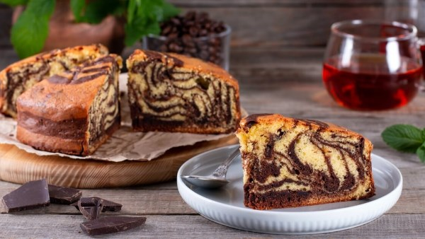 ادهني قالبًا بالسمن ورشي قليلًا من الدقيق، ثم صبي خليط الكيك السادة ثم فوقه خليط الكاكاو وحرّكي الخليط قليلًا للحصول على شكل التايجر.