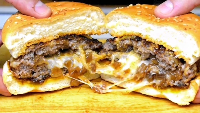 اجمع الساندويتش: ادهن الخبز بالصلصة، ثم أضف البرجر مع الجبن، وزينه بالبصل أو المخلل حسب الرغبة، ثم أغلقه.