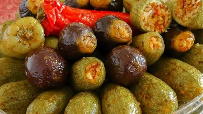 ½ كيلو باذنجان أبيض، ½ كيلو باذنجان أسود، ½ كيلو كوسة، ½ كيلو لحمة مفرومة بدون دهون، 2 كوب كينوا مشكل، 4 ملاعق كبيرة صلصة، 2 حزمة بقدونس، 2 حزمة كزبرة، 1 حزمة شبت، ½ كيلو طماطم مبشورة، 3 بصل مفروم، بهارات لحمة، شطة مجففة متكسرة، 3 ملاعق كبيرة زيت زيتون، ملح، فلفل أسود، 2 لتر شوربة دجاج، ½ لتر عصير طماطم، بهارات لحمة.
