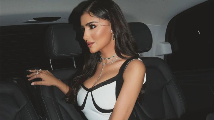 انتعلت حذاءً أنيقًا ذا كعب عالٍ باللون الأسود مع حقيبة يد صغيرة وتزيّنت بمجوهرات بسيطة.