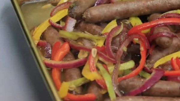 ابدأ بتحضير المقادير الأساسية وهي: سجق، دبس رمان، ثوم مقطع شرائح، فلفل حار أخضر وأحمر مفرومان، فلفل ألوان مقطع شرائح، بصل أحمر مقطع إلى شرائح طولية رفيعة (جوليان)، ملح وفلفل.