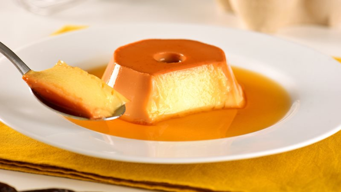 في قالب انجلش كيك ضع الكراميل أولاً، وفوقه صب خليط الكريم كراميل وتوزيعه بالتساوي.